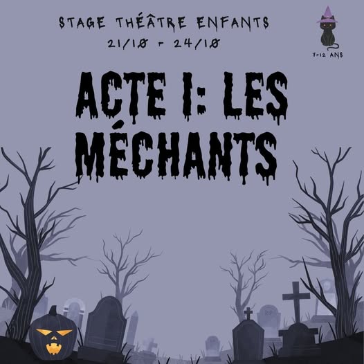 Du 20/10 au 24/10 Et si, pour une fois, les méchants devenaient les héros de l’histoire ? Pendant ce stage ludique et créatif, les enfants exploreront les coulisses du mal… avec humour et imagination ! À travers des jeux théâtraux, des improvisations et la création d’une mini-représentation, ils incarneront sorciers, monstres, pirates ou vilains de contes, et découvriront que même les méchants ont parfois un cœur… Un stage pour libérer son imagination, développer sa confiance en soi et s’amuser ensemble sur scène ! Tarifs 110€ Réduction de 10% pour les participants aux ateliers Horaire 9h-16h Garderie gratuit 8h00 – 17h00